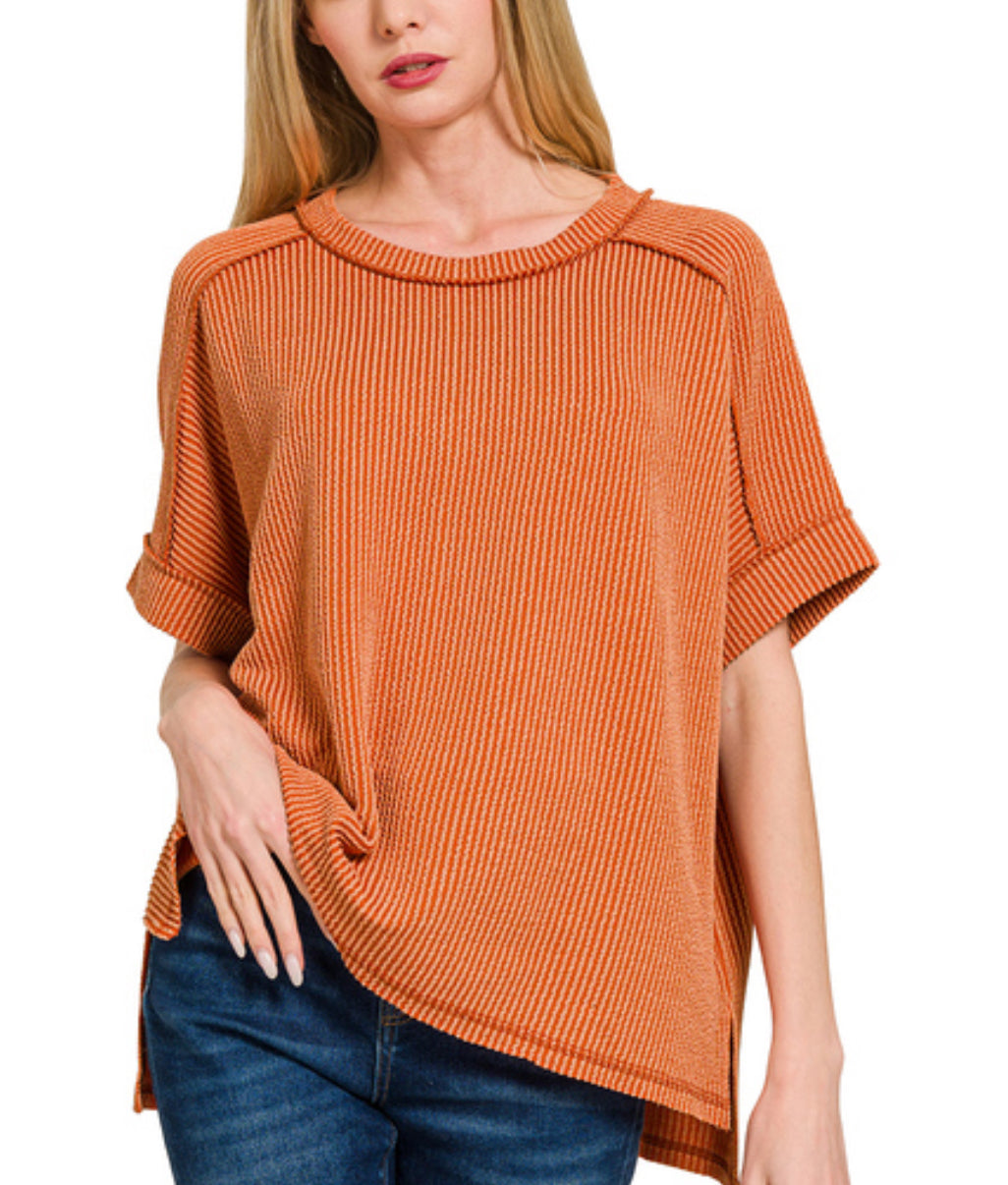 Burnt Orange Ribbed Cuff Sleeve Top
