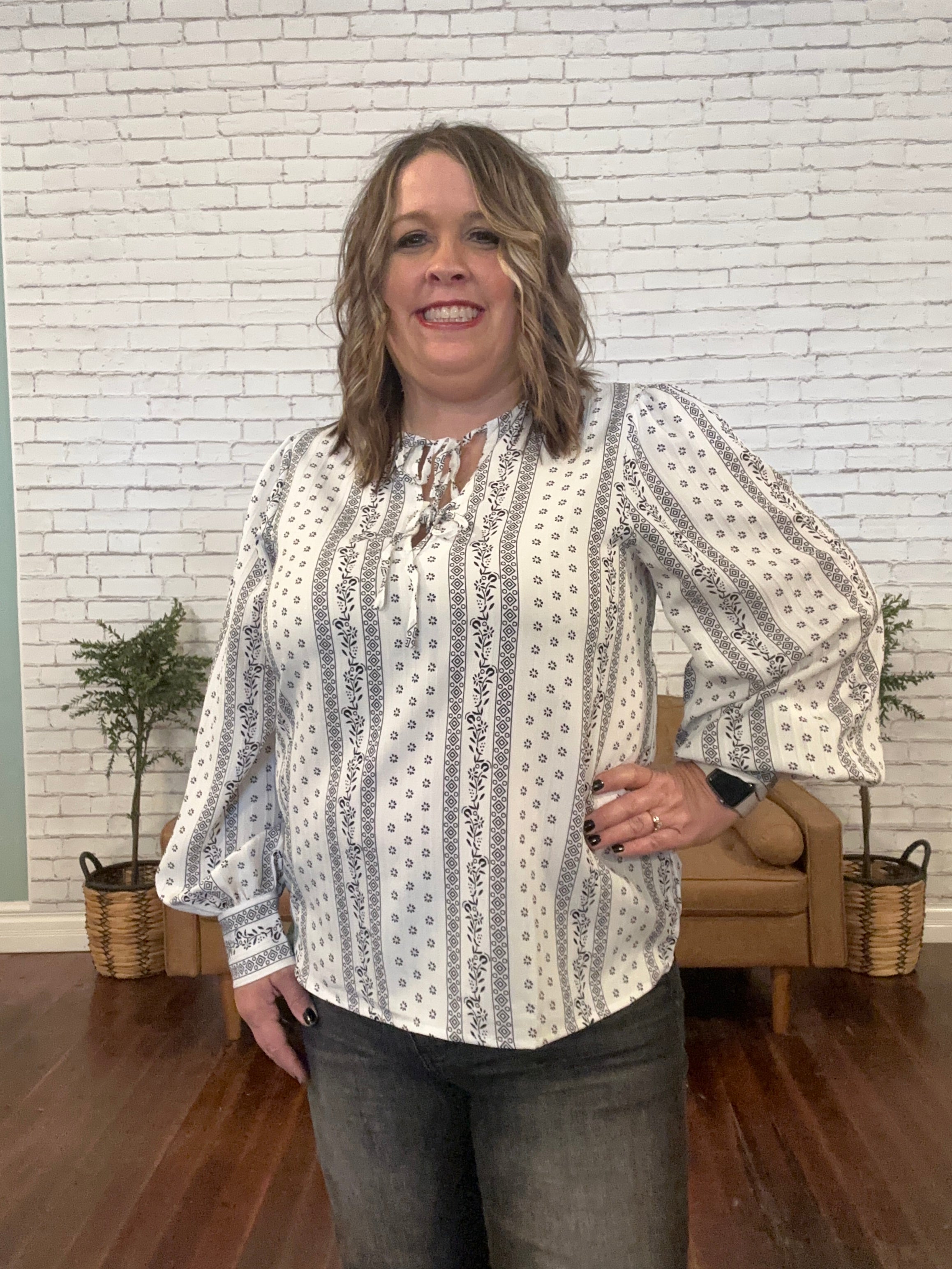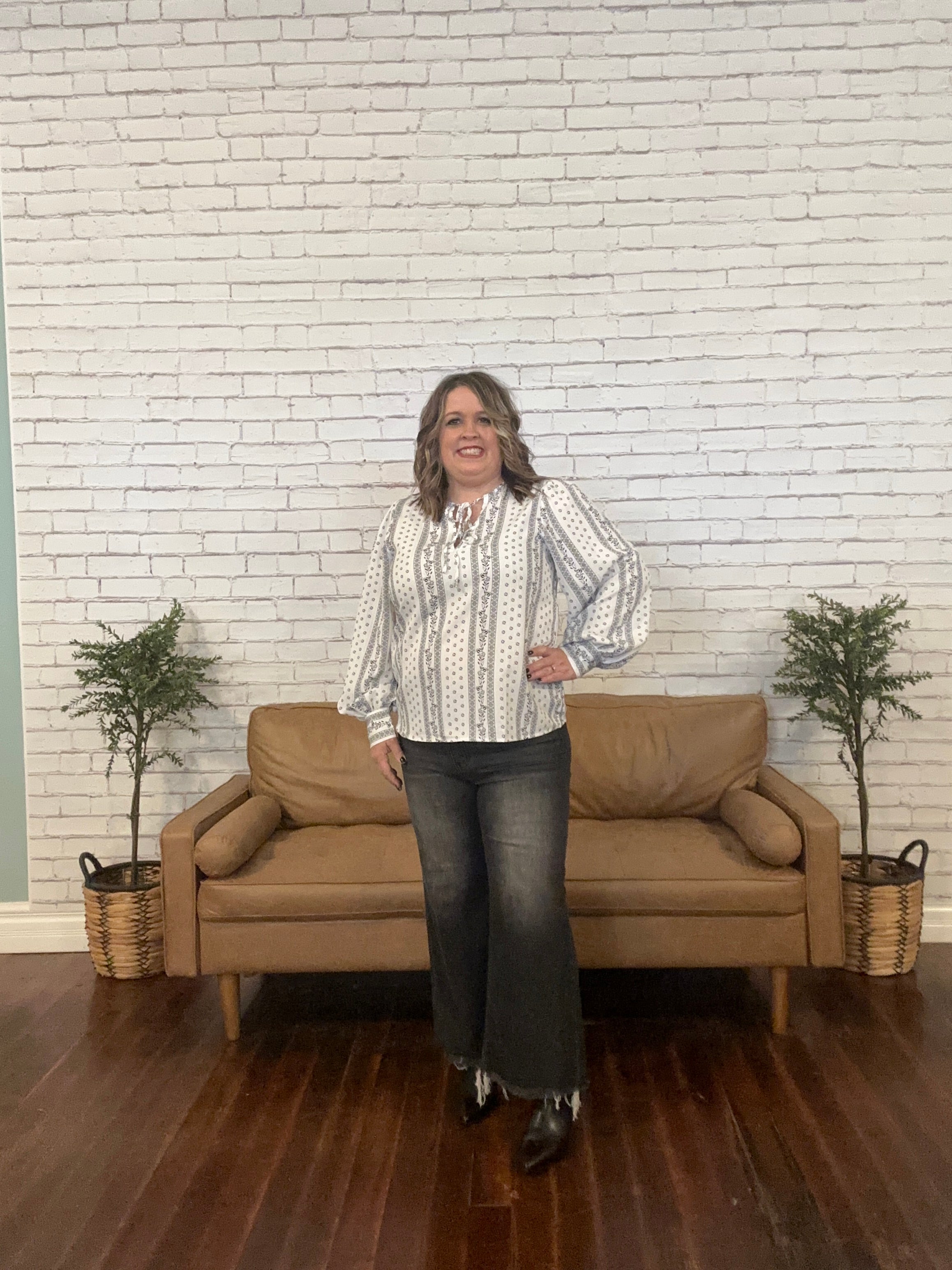 This simple beauty features a split tie neck and vertical floral design.  Long Puff Sleeve with 2 button closure.  This top is perfect for dressing up.
