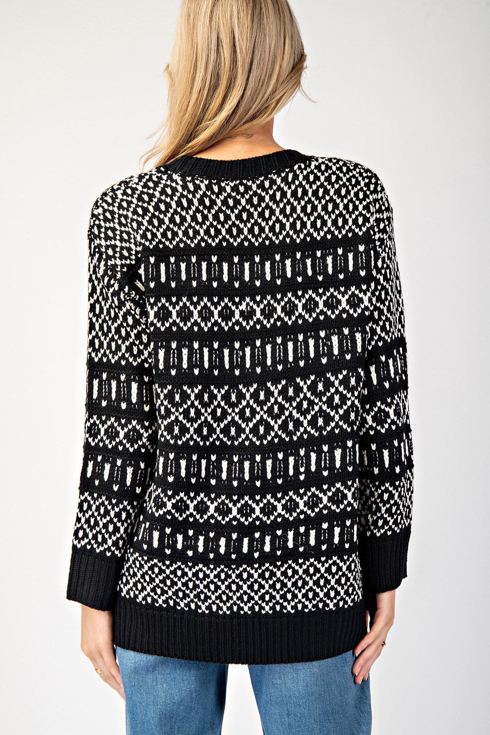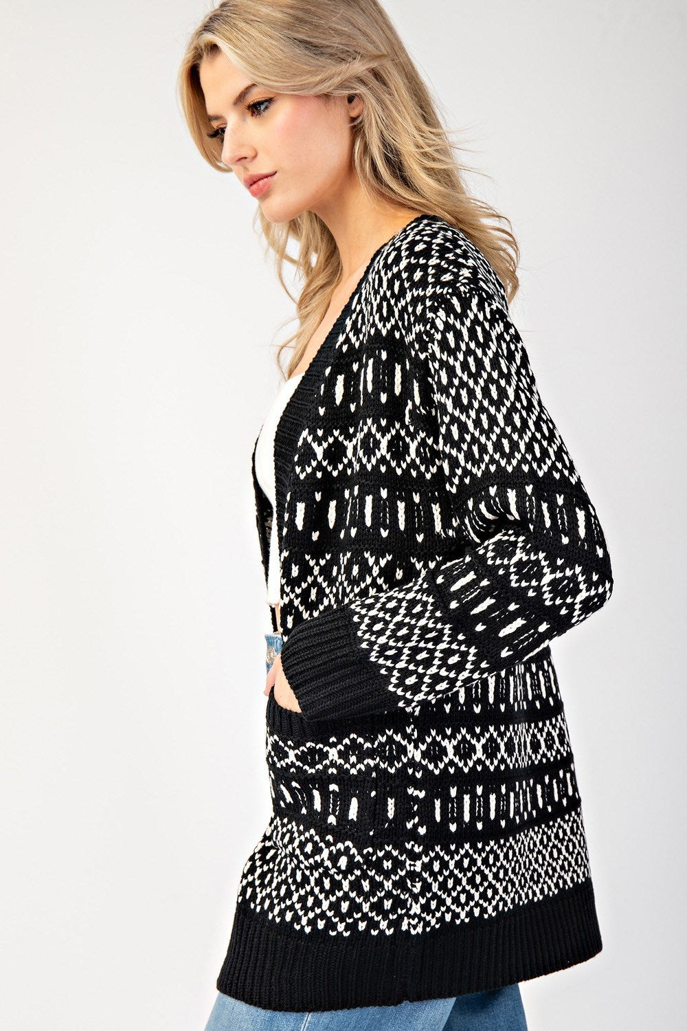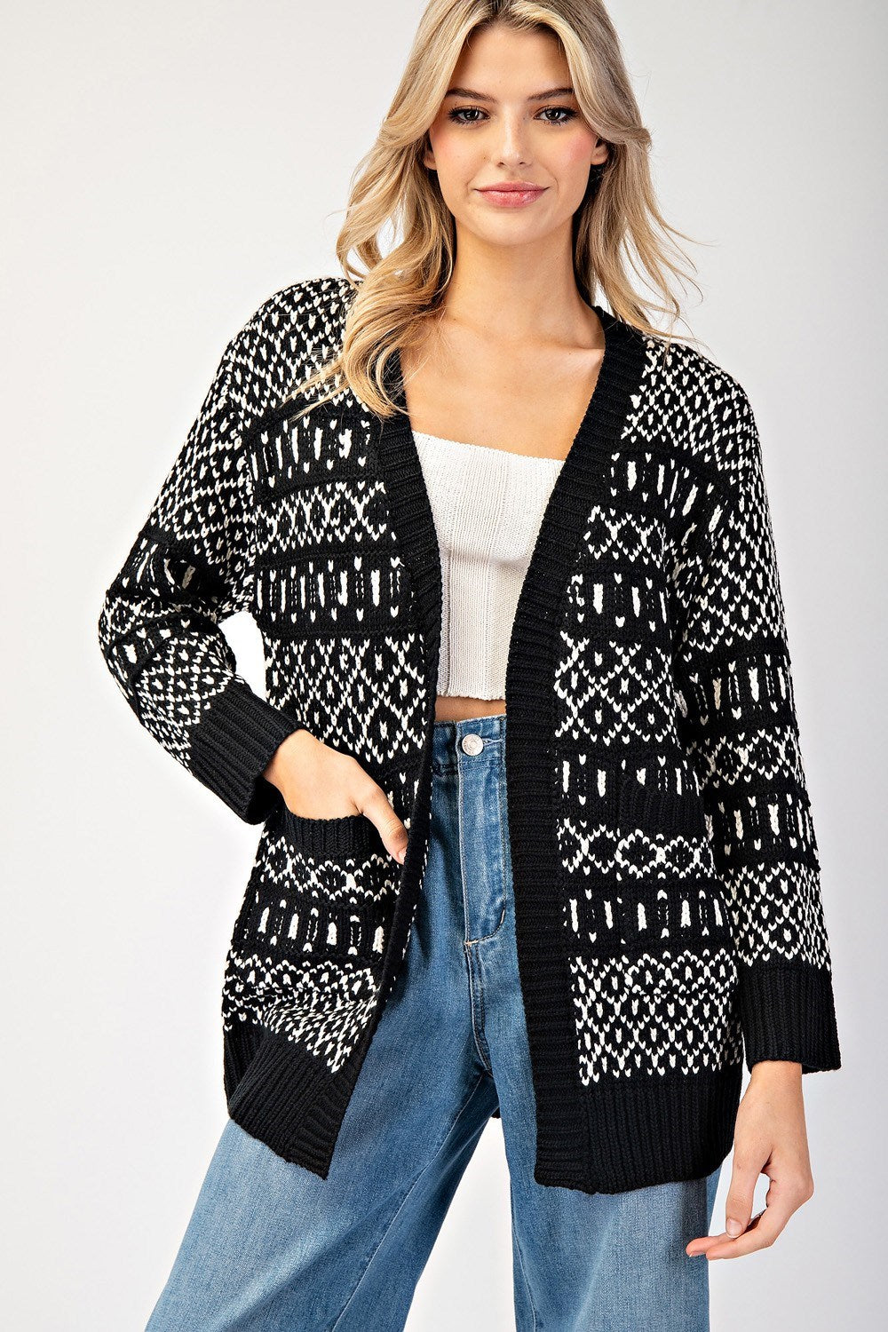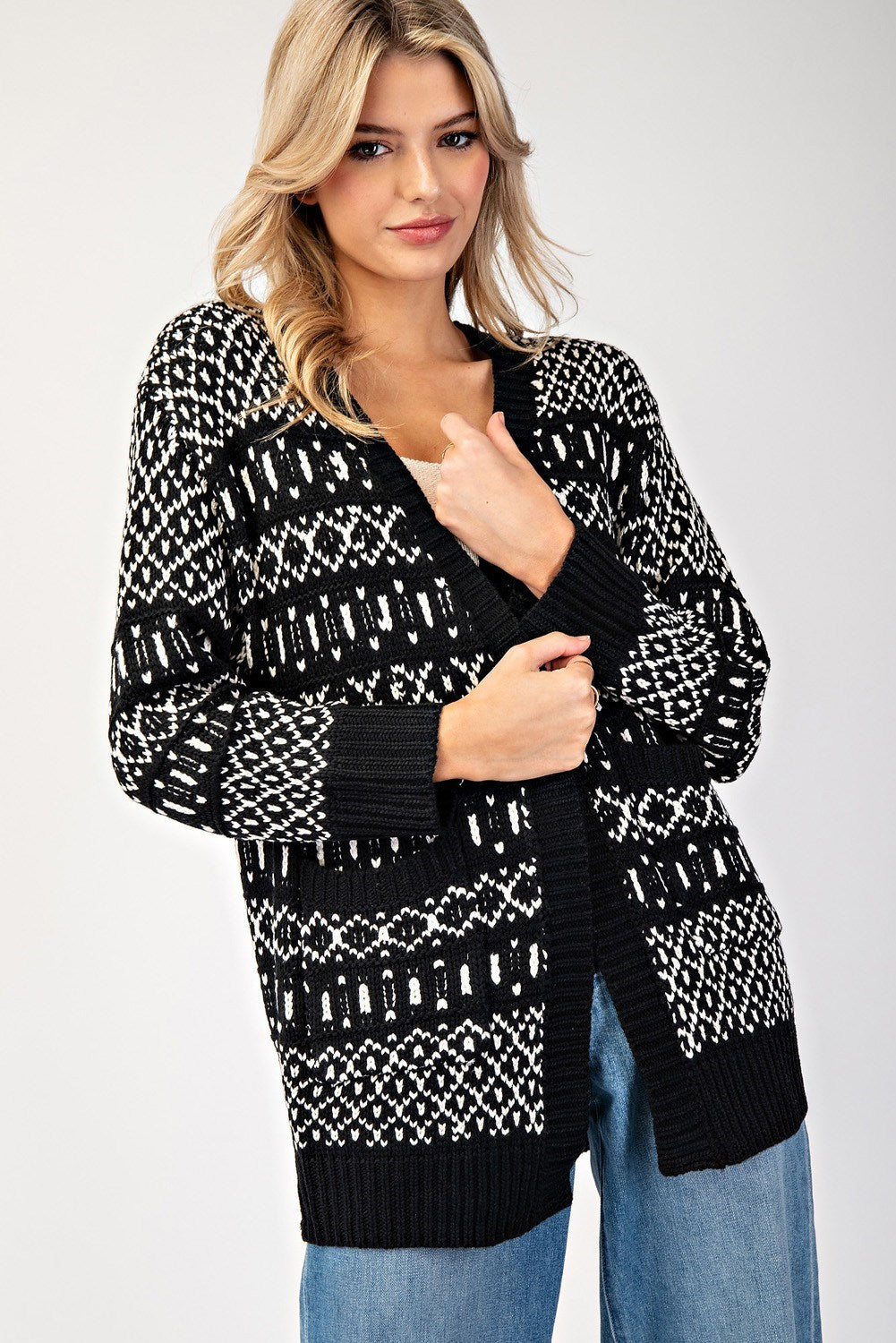 Long sleeve patterned cardigan featuring an open front, a thick knit material, two open front pockets, a tunic length and ribbed cuffs.