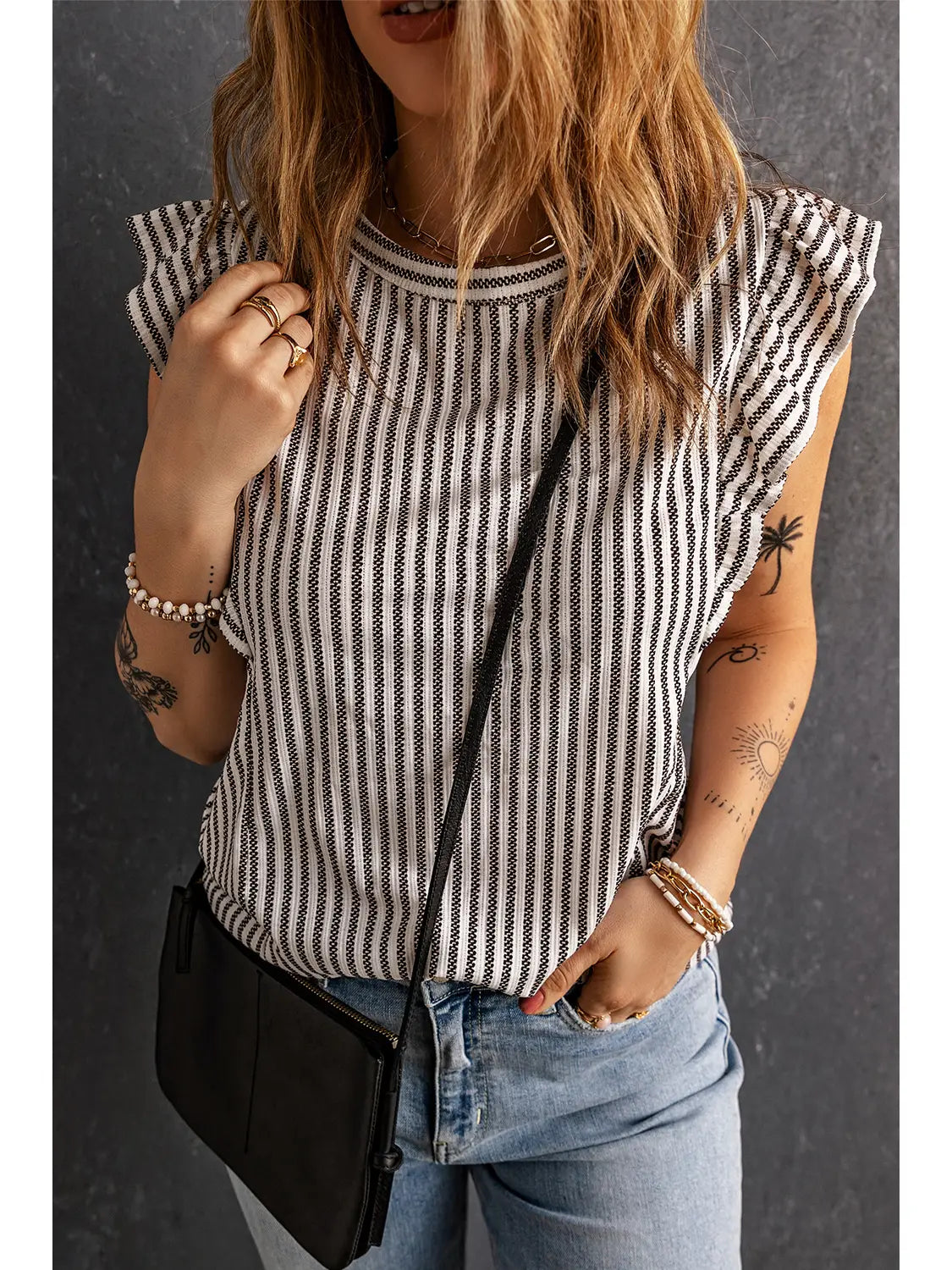 Neutral but not plain ... Dressy & Casual ... This top should be a closet staple. The striped top is casual & chic. The ruffled design adds elegance. It features a crew neck & slim fit style.